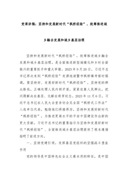 【七哥公文】2024年:党课讲稿:坚持和发展新时代“枫桥经验”,统筹推进城乡融合发展和城乡基层治理+更多免费公文+VX:QiGeGongWen2024