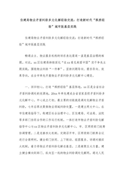 【七哥公文】2024年:住建局物业矛盾纠纷多元化解经验交流:打造新时代“枫桥经验”城市版基层实践+更多免费公文+VX:QiGeGongWen2024