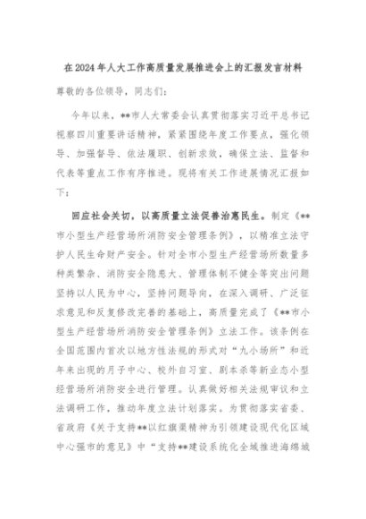 【七哥公文】2024年:在2024年人大工作高质量发展推进会上的汇报发言材料+更多免费公文+VX:QiGeGongWen2024