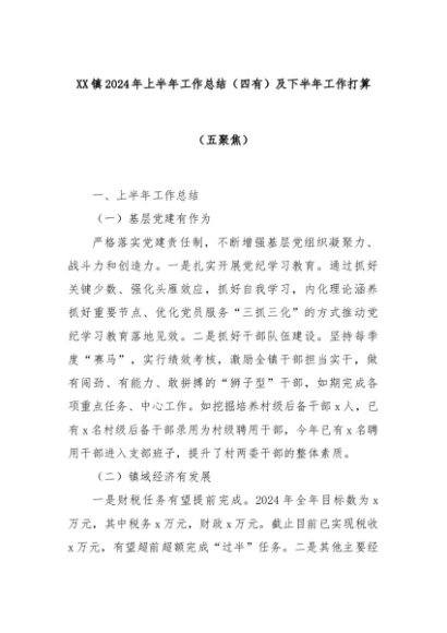 【七哥公文】2024年:XX镇2024年上半年工作总结(四有)及下半年工作打算(五聚焦)+更多免费公文+VX:QiGeGongWen2024