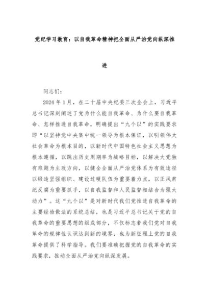 【七哥公文】2024年:党纪学习教育:以自我革命精神把全面从严治党向纵深推进+更多免费公文+VX:QiGeGongWen2024