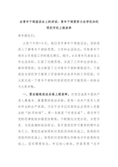 【七哥公文】2024年:在青年干部座谈会上的讲话:青年干部要努力在学纪知纪明纪守纪上做表率+更多免费公文+VX:QiGeGongWen2024