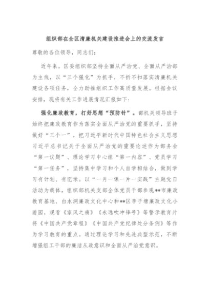 / 【七哥公文】2024年:组织部在全区清廉机关建设推进会上的交流发言+更多免费公文+VX:QiGeGongWen2024
