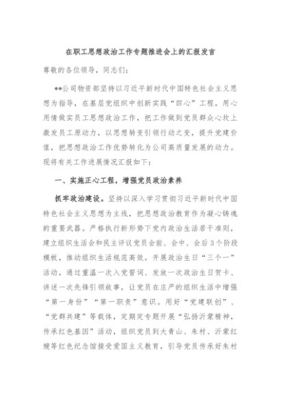 / 【七哥公文】2024年:在职工思想政治工作专题推进会上的汇报发言+更多免费公文+VX:QiGeGongWen2024