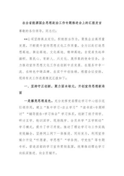 / 【七哥公文】2024年:在全省能源国企思想政治工作专题推进会上的汇报发言+更多免费公文+VX:QiGeGongWen2024