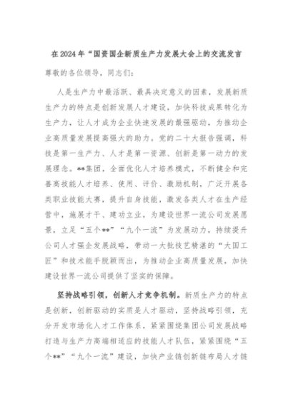 【七哥公文】2024年:在2024年“国资国企新质生产力发展大会上的交流发言+更多免费公文+VX:QiGeGongWen2024