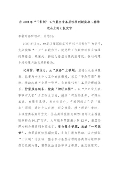 【七哥公文】2024年:在2024年“三长制”工作暨全省基层治理创新实验工作推进会上的汇报发言+更多免费公文+VX:QiGeGongWen2024