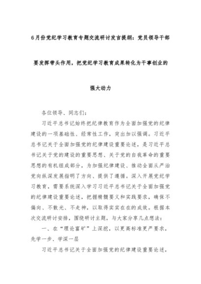 【七哥公文】2024年:6月份党纪学习教育专题交流研讨发言提纲:党员领导干部要发挥带头作用,把党纪学习教育成果转化为干事创业的强大动力+更多免费公文+VX:QiGeGongWen2024