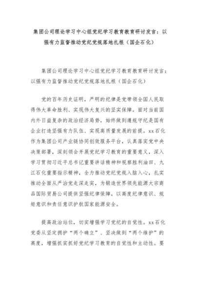 【七哥公文】2024年:集团公司理论学习中心组党纪学习教育教育研讨发言:以强有力监督推动党纪党规落地扎根(国企石化)+更多免费公文+VX:QiGeGongWen2024