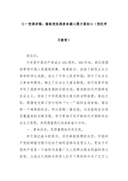 【七哥公文】2024年:七一党课讲稿:锤炼党性践使命凝心聚力葆初心(党纪学习教育)+更多免费公文+VX:QiGeGongWen2024