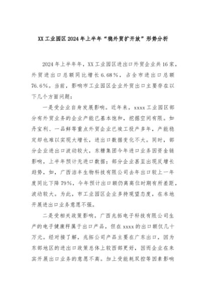 【七哥公文】2024年:XX工业园区2024年上半年“稳外贸扩开放”形势分析+更多免费公文+VX:QiGeGongWen2024