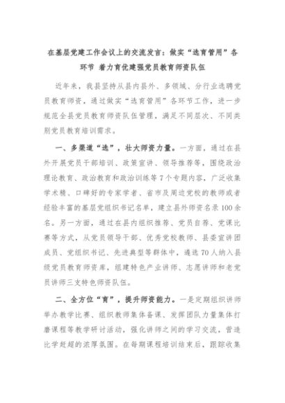 【七哥公文】2024年:在基层党建工作会议上的交流发言:做实“选育管用”各环节 着力育优建强党员教育师资队伍+更多免费公文+VX:QiGeGongWen2024