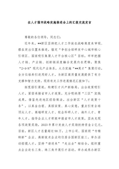 / 【七哥公文】2024年:在人才强市战略实施推进会上的汇报交流发言+更多免费公文+VX:QiGeGongWen2024