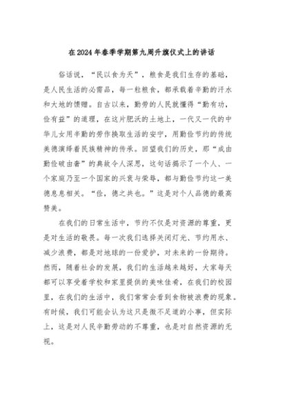 / 【七哥公文】2024年:在2024年春季学期第九周升旗仪式上的讲话+更多免费公文+VX:QiGeGongWen2024