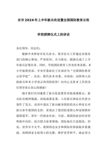 【七哥公文】2024年:在市2024年上半年新兵欢送暨全国国防教育示范学校授牌仪式上的讲话+更多免费公文+VX:QiGeGongWen2024