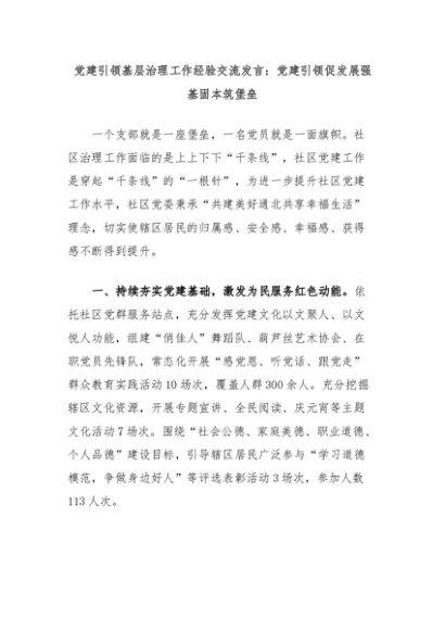 【七哥公文】2024年:党建引领基层治理工作经验交流发言:党建引领促发展强基固本筑堡垒+更多免费公文+VX:QiGeGongWen2024