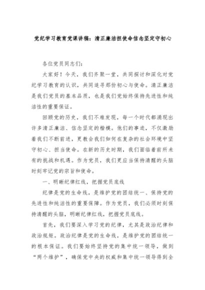 【七哥公文】2024年:党纪学习教育党课讲稿:清正廉洁担使命信念坚定守初心+更多免费公文+VX:QiGeGongWen2024