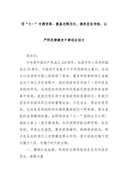 【七哥公文】2024年:迎“七一”专题党课:重温光辉历史,继承优良传统,以严明纪律激发干事创业活力+更多免费公文+VX:QiGeGongWen2024