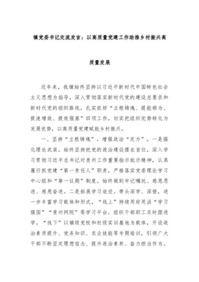 【七哥公文】2024年:镇党委书记交流发言:以高质量党建工作助推乡村振兴高质量发展+更多免费公文+VX:QiGeGongWen2024