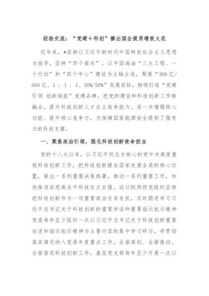 / 【七哥公文】2024年:经验交流:“党建+科创”擦出国企提质增效火花+更多免费公文+VX:QiGeGongWen2024