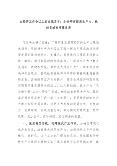 【七哥公文】2024年:在经济工作会议上的交流发言:加快培育新质生产力,赋能县域高质量发展+更多免费公文+VX:QiGeGongWen2024