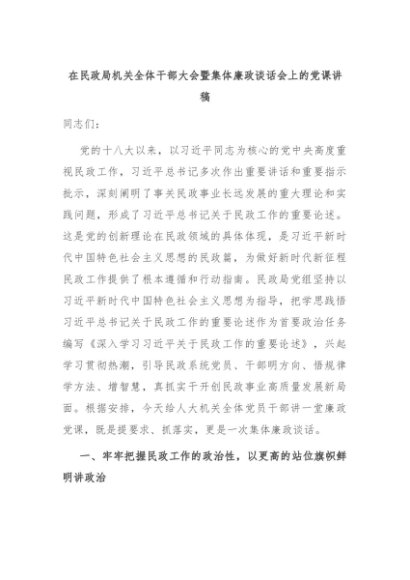 【七哥公文】2024年:在民政局机关全体干部大会暨集体廉政谈话会上的党课讲稿+更多免费公文+VX:QiGeGongWen2024