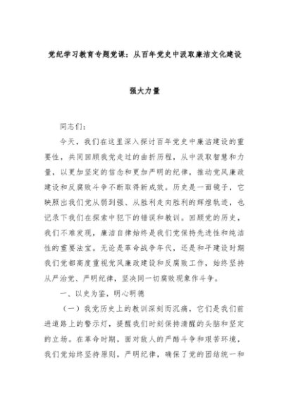 【七哥公文】2024年:党纪学习教育专题党课:从百年党史中汲取廉洁文化建设强大力量+更多免费公文+VX:QiGeGongWen2024