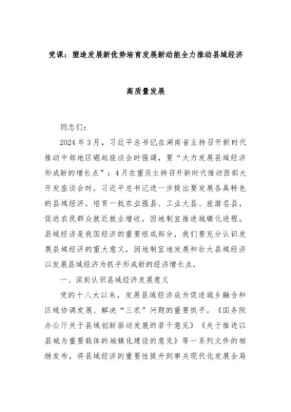 【七哥公文】2024年:党课:塑造发展新优势培育发展新动能全力推动县域经济高质量发展+更多免费公文+VX:QiGeGongWen2024
