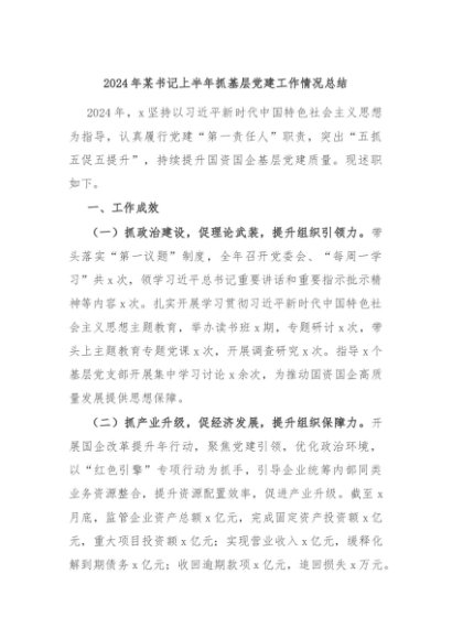 / 【七哥公文】2024年:2024年某书记上半年抓基层党建工作情况总结+更多免费公文+VX:QiGeGongWen2024