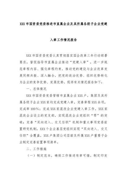 【七哥公文】2024年:XXX市国资委党委推进市直属企业及其所属各级子企业党建入章工作情况报告+更多免费公文+VX:QiGeGongWen2024