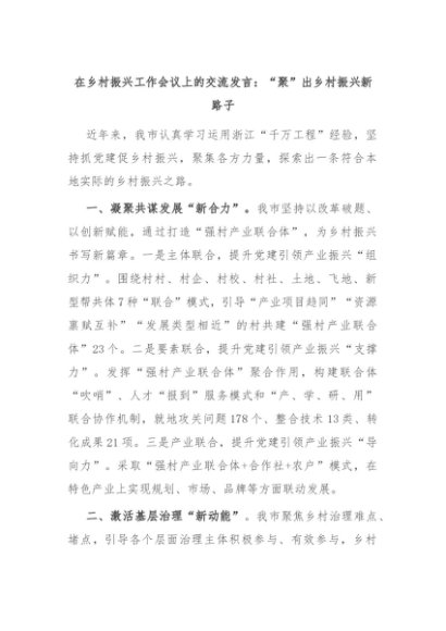 【七哥公文】2024年:在乡村振兴工作会议上的交流发言:“聚”出乡村振兴新路子+更多免费公文+VX:QiGeGongWen2024