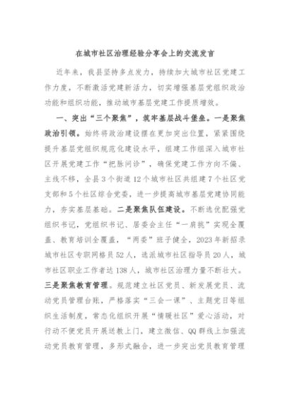 / 【七哥公文】2024年:在城市社区治理经验分享会上的交流发言+更多免费公文+VX:QiGeGongWen2024