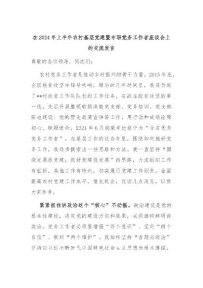 【七哥公文】2024年:在2024年上半年农村基层党建暨专职党务工作者座谈会上的交流发言+更多免费公文+VX:QiGeGongWen2024