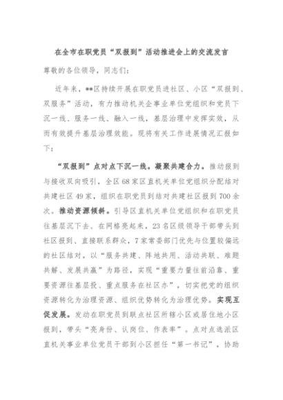 / 【七哥公文】2024年:在全市在职党员“双报到”活动推进会上的交流发言+更多免费公文+VX:QiGeGongWen2024