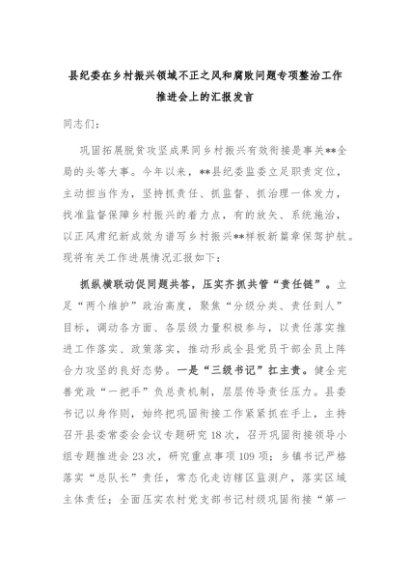 【七哥公文】2024年:县纪委在乡村振兴领域不正之风和腐败问题专项整治工作推进会上的汇报发言+更多免费公文+VX:QiGeGongWen2024