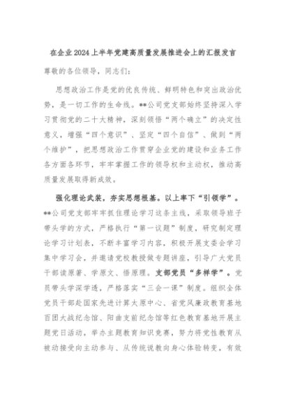 【七哥公文】2024年:在企业2024上半年党建高质量发展推进会上的汇报发言+更多免费公文+VX:QiGeGongWen2024