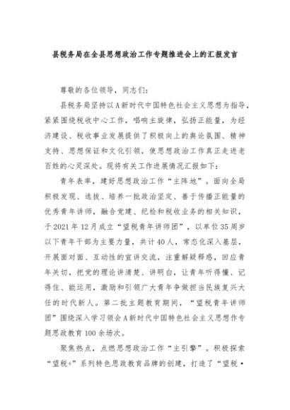 / 【七哥公文】2024年:县税务局在全县思想政治工作专题推进会上的汇报发言+更多免费公文+VX:QiGeGongWen2024
