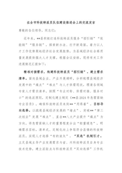/ 【七哥公文】2024年:在全市科技特派员队伍建设推进会上的交流发言+更多免费公文+VX:QiGeGongWen2024