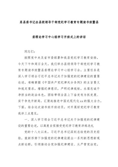 【七哥公文】2024年:某县委书记在县级领导干部党纪学习教育专题读书班暨县委理论学习中心组学习开班式上的讲话+更多免费公文+VX:QiGeGongWen2024