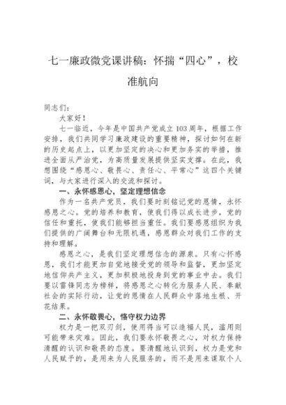 / 【七哥公文】2024年:七一廉政微党课讲稿:怀揣“四心”,校准航向+更多免费公文+VX:QiGeGongWen2024