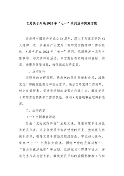 【七哥公文】2024年:X局关于开展2024年“七一”系列活动实施方案+更多免费公文+VX:QiGeGongWen2024