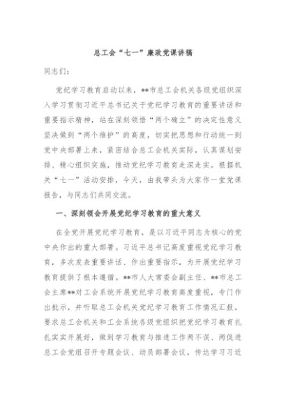 / 【七哥公文】2024年:总工会“七一”廉政党课讲稿+更多免费公文+VX:QiGeGongWen2024