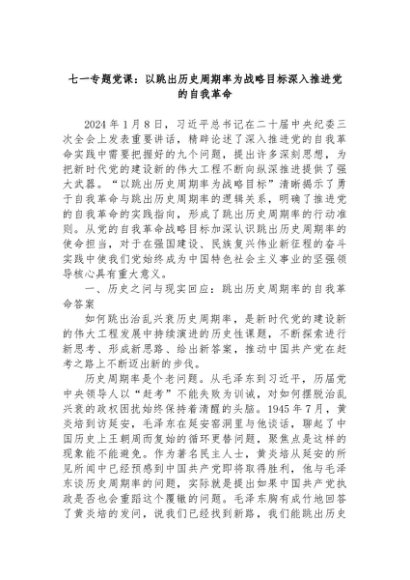 【七哥公文】2024年:七一专题党课:以跳出历史周期率为战略目标深入推进党的自我革命+更多免费公文+VX:QiGeGongWen2024