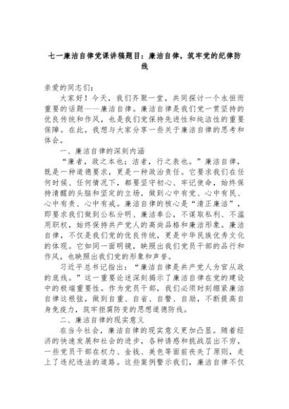 【七哥公文】2024年:七一廉洁自律党课讲稿题目:廉洁自律,筑牢党的纪律防线+更多免费公文+VX:QiGeGongWen2024