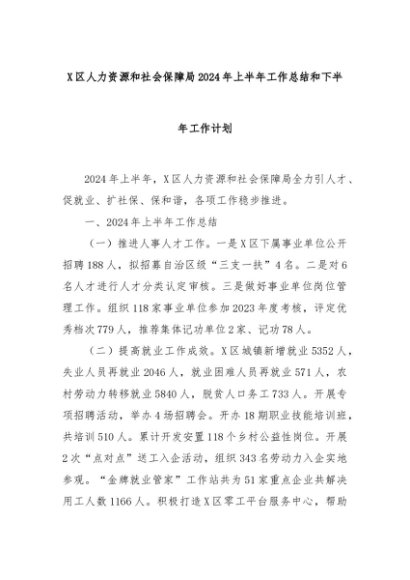 【七哥公文】2024年:X区人力资源和社会保障局2024年上半年工作总结和下半年工作计划+更多免费公文+VX:QiGeGongWen2024