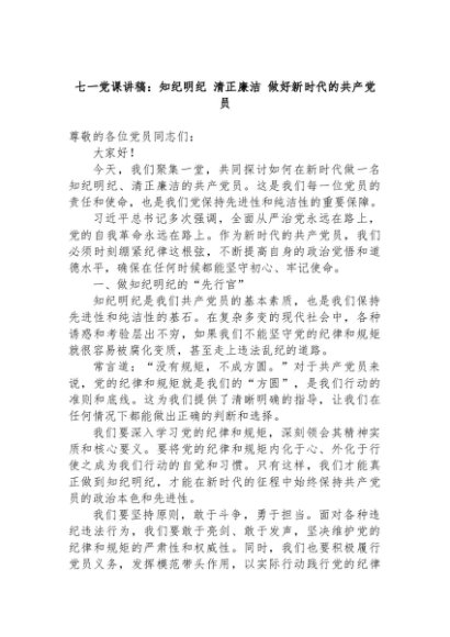 【七哥公文】2024年:七一党课讲稿:知纪明纪,清正廉洁,做好新时代的共产党员+更多免费公文+VX:QiGeGongWen2024