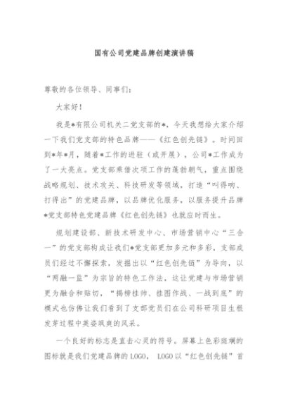 / 【七哥公文】2024年:国有公司党建品牌创建演讲稿+更多免费公文+VX:QiGeGongWen2024