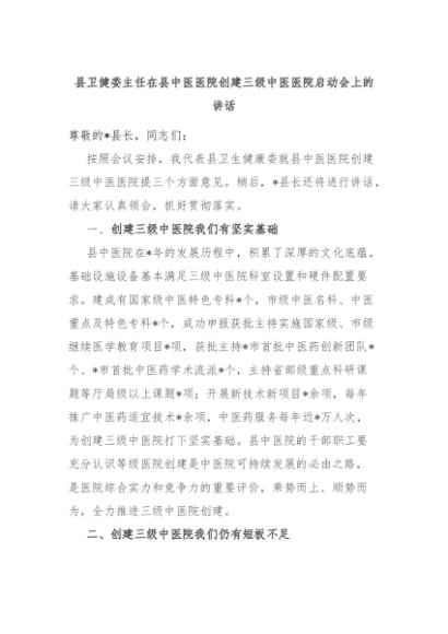 【七哥公文】2024年:县卫健委主任在县中医医院创建三级中医医院启动会上的讲话+更多免费公文+VX:QiGeGongWen2024