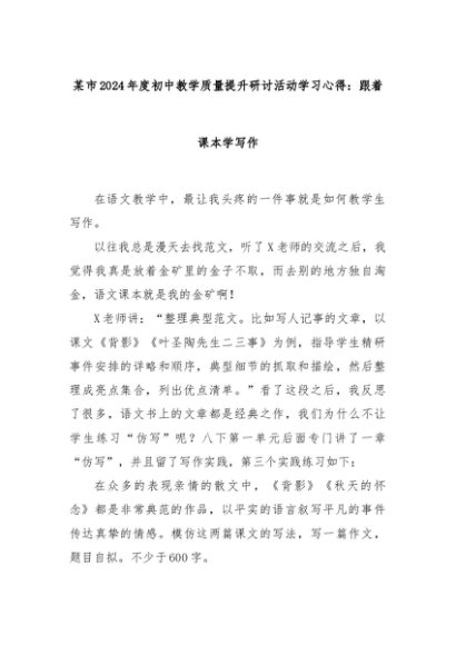 【七哥公文】2024年:某市2024年度初中教学质量提升研讨活动学习心得:跟着课本学写作+更多免费公文+VX:QiGeGongWen2024