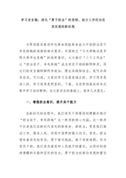 【七哥公文】2024年:学习发言稿:深化“勇于担当”的觉悟,助力工作迈向优质发展的新征程+更多免费公文+VX:QiGeGongWen2024
